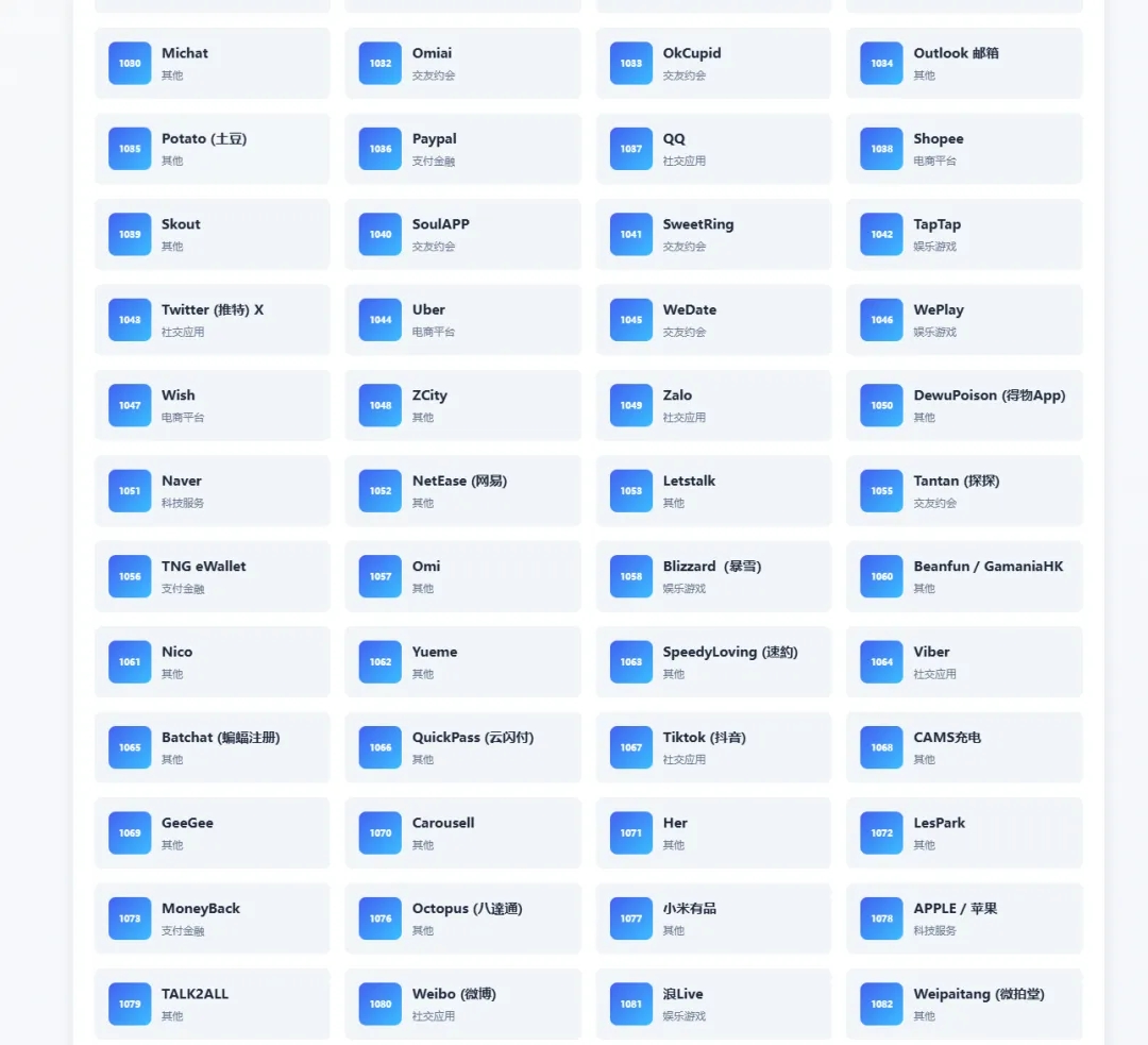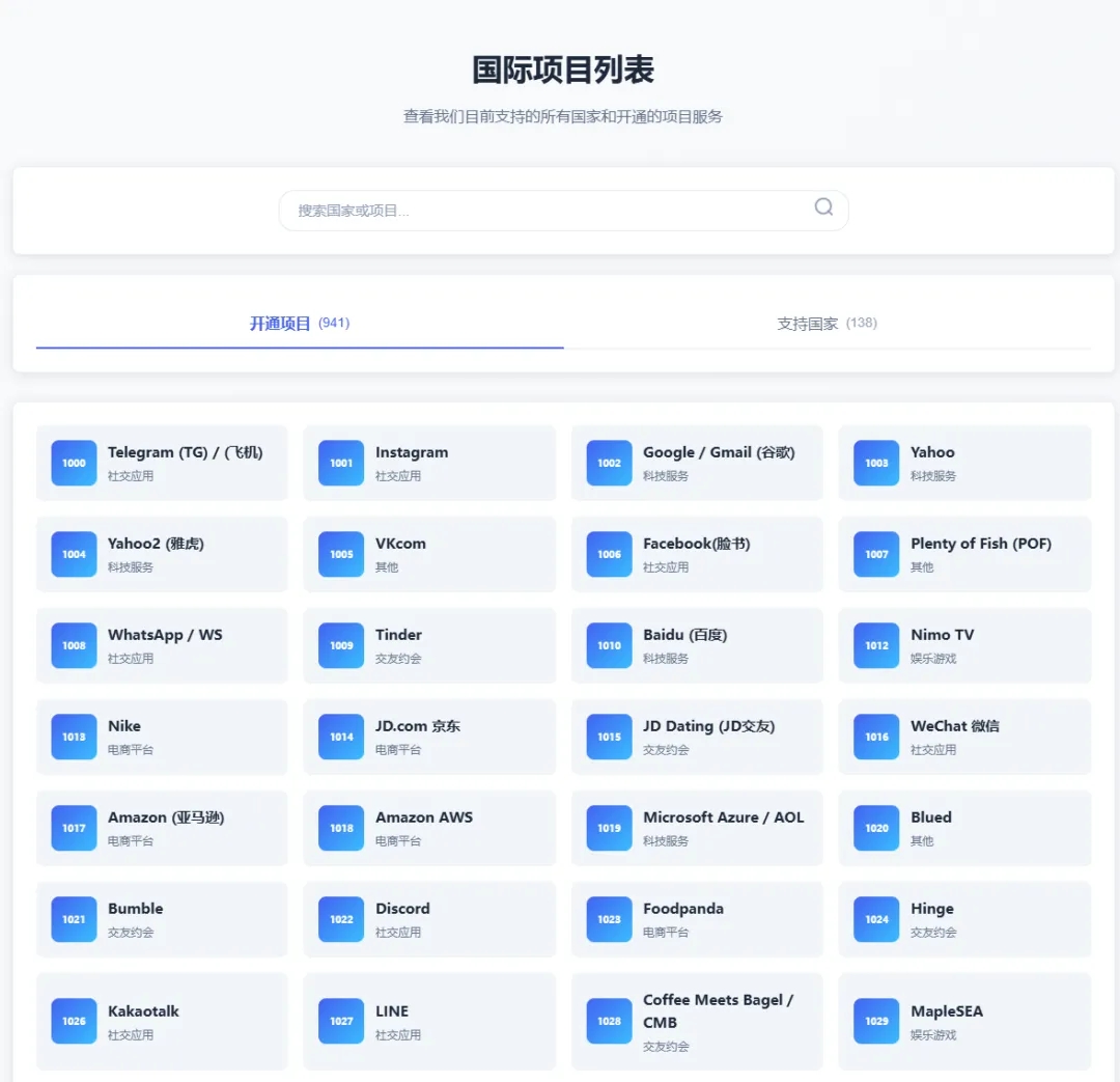 我们可以看一下它支持的国外平台,一共有941个那么多,涵盖了社交,电商,购物,邮箱,科技服务等多种类别。同时支持138国家号码,号段,简直是赢麻了。