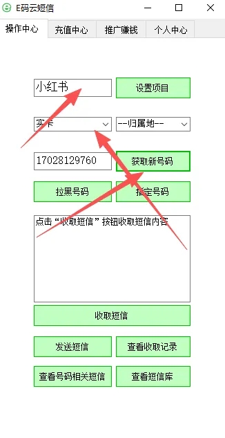 进入平台后,充值完成了,就打上小红书的关键词。选择实卡,获取号码。