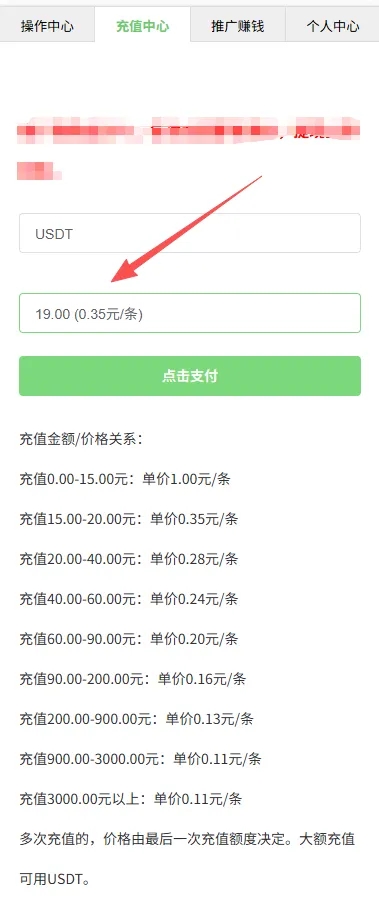 第二步,进入充值中心,选择适合你自己的套餐进行充值。最低19元起充,一条接码0.35元