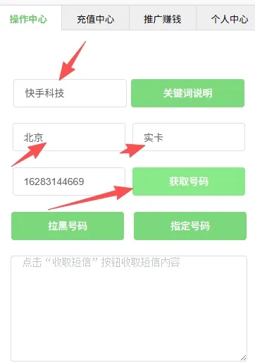 第三步,充值完成后,返回【操作中心】,打上你要接码的平台关键词,不懂的看一下关键词说明。