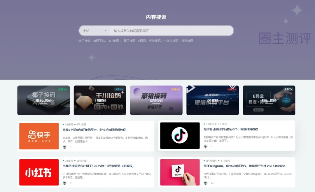 有很多小伙伴都是搜索接码平台来的,证明这个需求还是蛮大的。而圈主测评网也是一个专门搜罗全网好用接码平台的网站,并且持续更新接码平台,短信验证平台的教程和干货,希望能帮助到更多的互联网人士,更好更快地使用接码平台。