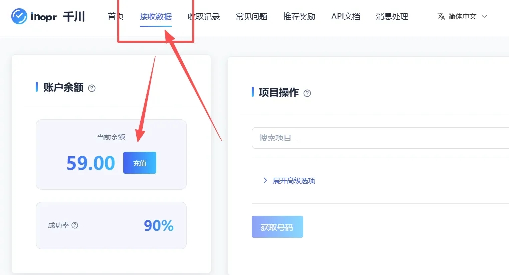 第二步,注册登录后,点击顶部栏【接收数据】,然后充值。不充值是无法获取有效手机号去接码的,这个大家都知道。